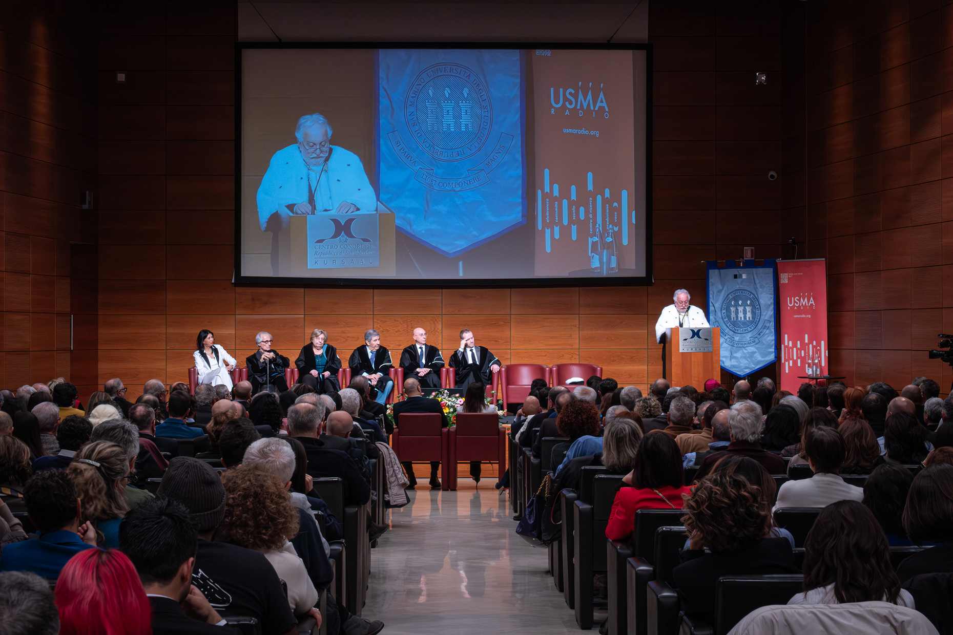 Si è aperta con un telo sul quale era riportata una serie di messaggi di pace, la cerimonia di inaugurazione dell’Anno Accademico 2024-25 dell’Università degli Studi della Repubblica di San Marino: sorretto da sedici studenti, largo circa dodici metri e lungo sette, ha attraversato la sala del Centro Congressi Kursaal passando sopra le teste del pubblico in un gesto dal quale sono emersi l’attenzione e la sensibilità della comunità universitaria rispetto alla situazione internazionale, sintetizzata dal Rettore Corrado Petrocelli: “Essere indifferenti, voltarci dall’altra parte, noi non dobbiamo e non vogliamo farlo”, ha affermato. “Oggi sono in atto 53 conflitti, il numero più alto dalla fine della seconda guerra mondiale”. E ancora, dopo aver parlato di Gaza: “Lo scorso anno avevamo chiesto il cessate il fuoco e questa volta iniziamo così”.