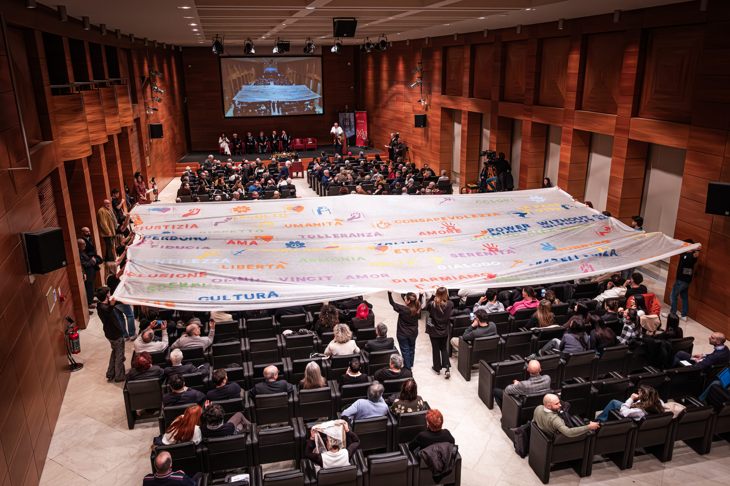 L’azione si fonda su un forte senso di unità e solidarietà: ogni spettatore è invitato, se lo desidera, ad allungare una mano per far avanzare il telo, diventando parte attiva di un movimento collettivo per la pace. In questo gesto semplice si manifesta la forza della partecipazione, un atto di responsabilità condivisa verso un obiettivo comune: la costruzione di un mondo più giusto e pacifico.