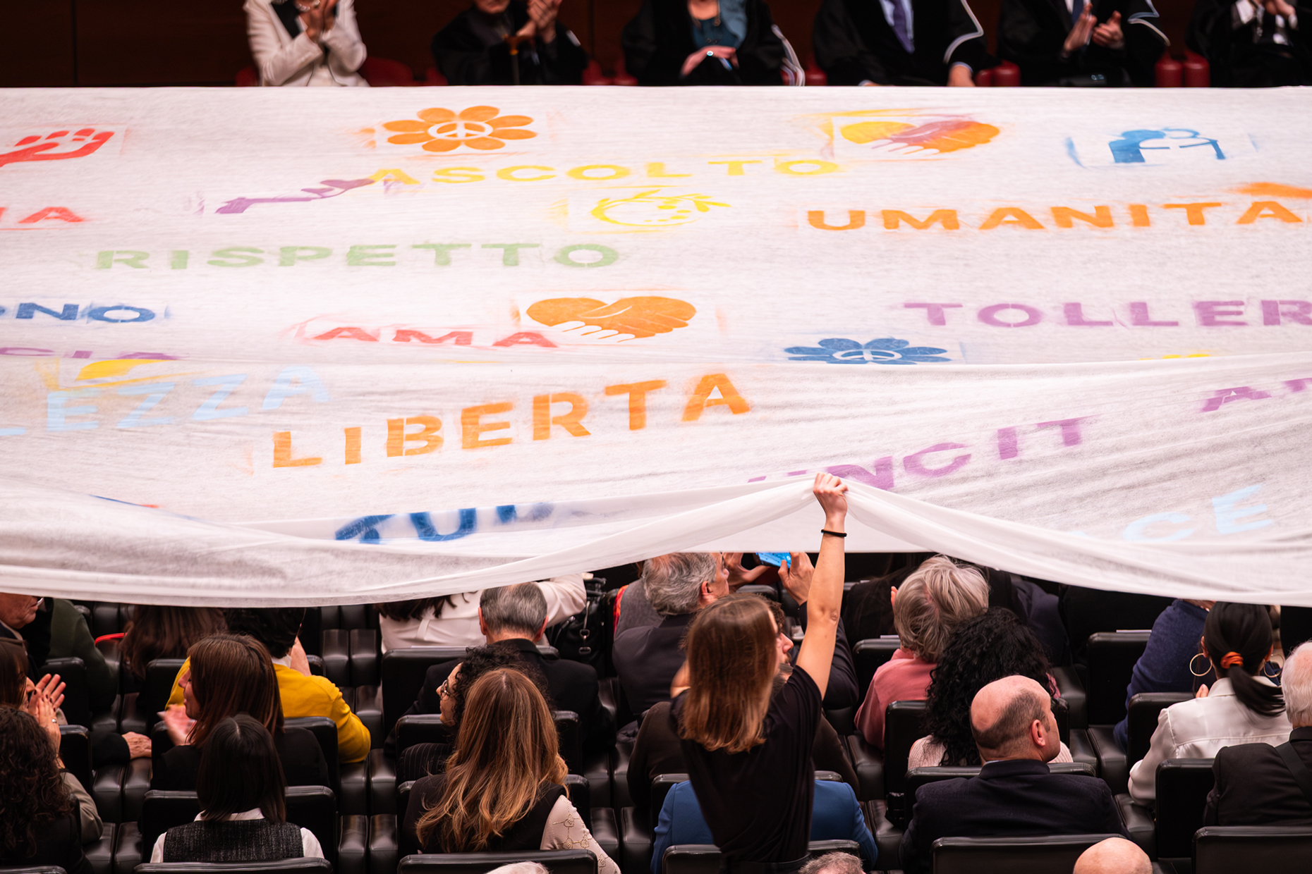 Il telo della pace apre l’Anno Accademico dell’Università di San Marino, il Rettore: “Non ci voltiamo dall’altra parte”