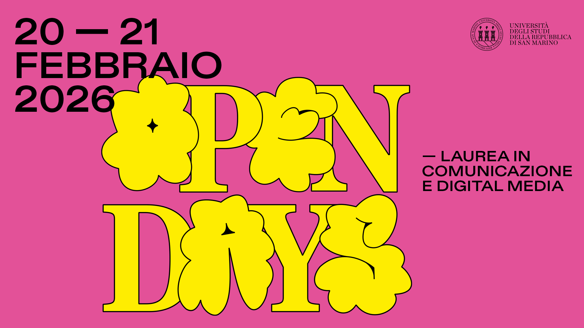 Allora vieni a trovarci venerdì 20 e sabato 21 febbraio 2026 agli Open Days del corso di laurea in Comunicazione e Digital Media dell’Università di San Marino!