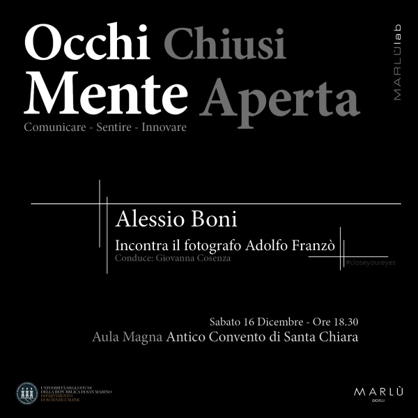 All’incontro del 16 dicembre saranno esposte alcune delle foto di Franzò, tratte dalla mostra fotografica “SHUT | Close Your Eyes” in cui icone del cinema come Robert De Niro, Sharon Stone, Leonardo Di Caprio, Monica Bellucci e celeb come Luciano Pavarotti o Federica Pellegrini, sono ritratte in modo sorprendente: a occhi chiusi. Per l’occasione è stato ritratto “ad occhi chiusi” l’attore Alessio Boni, una carriera iniziata con il teatro e il cinema d’autore di Liliana Cavani, Marco Tullio Giordana o Cristina Comencini, ha raggiunto la sua fama presso il grande pubblico grazie ai nuovi modi di racconto filmico: fiction e serie TV”. L’esperienza testimoniata dai nostri ospiti rappresenta un momento di approfondimento sul mondo del cinema e dello spettacolo fondamentale anche per gli iscritti al Corso di Alta Formazione in Produzione Audiovisiva e Cinematografica, da novembre ripartito con la seconda edizione.