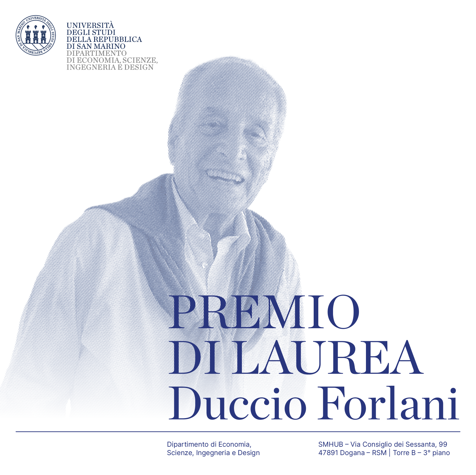 I figli, rappresentanti dello studio SGAI, fondato più di 60 anni fa da Edmondo “Duccio” Forlani, studio di ingegneria e geologia, con il coordinamento dell’Università degli Studi della Repubblica di San Marino (UNIRSM), sono lieti di annunciare la prima edizione del PREMIO DI LAUREA Duccio Forlani.