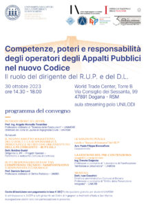Quali saranno gli spazi di manovra, gli strumenti, le opportunità e le sfide dei funzionari che seguono l’esecuzione degli appalti pubblici in Italia alla luce del nuovo codice recentemente adottato sul tema? Questa la domanda di fondo di un convegno organizzato dall’Università degli Studi della Repubblica di San Marino e in programma lunedì 30 ottobre nella sede dei corsi di laurea in Ingegneria Civile, a Dogana. In cattedra esperti, rappresentanti istituzionali, avvocati e accademici.