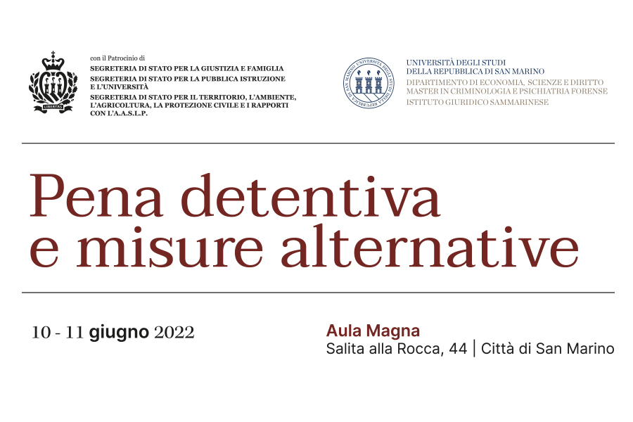 Studiosi dagli Atenei di Bologna, di Sassari e del Titano prenderanno la parola insieme a rappresentanti del Ministero della Giustizia italiano, della Divisione Anticrimine della Polizia di Stato e non solo durante la conferenza “Pena detentiva e misure alternative”, in programma venerdì 10 e sabato 11 giugno nella sede universitaria dell’Ex Tribunale, nel centro storico.