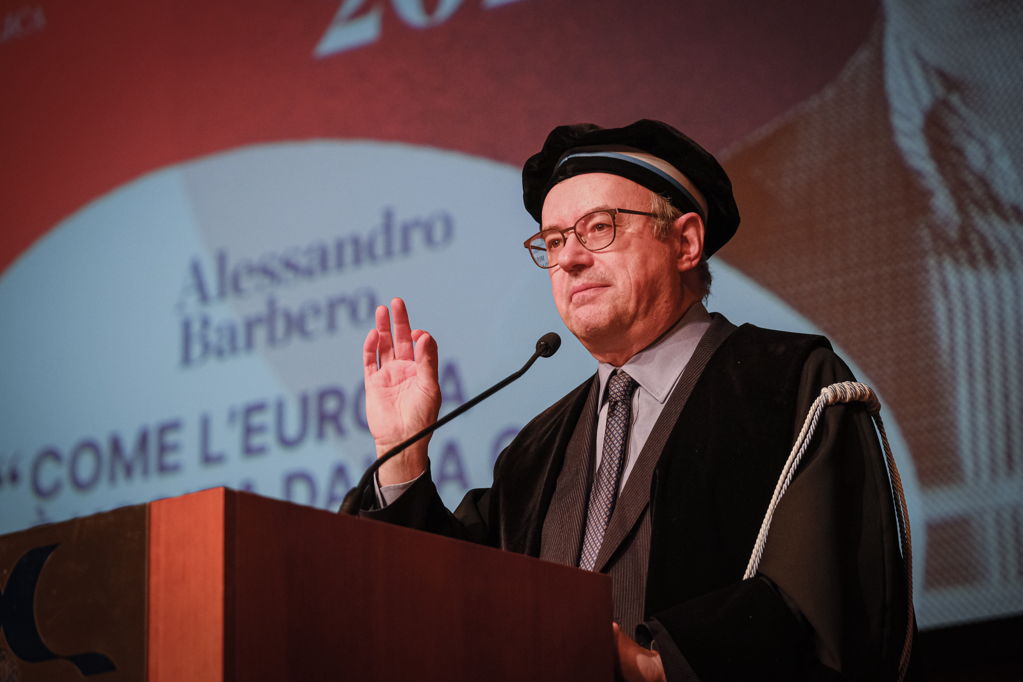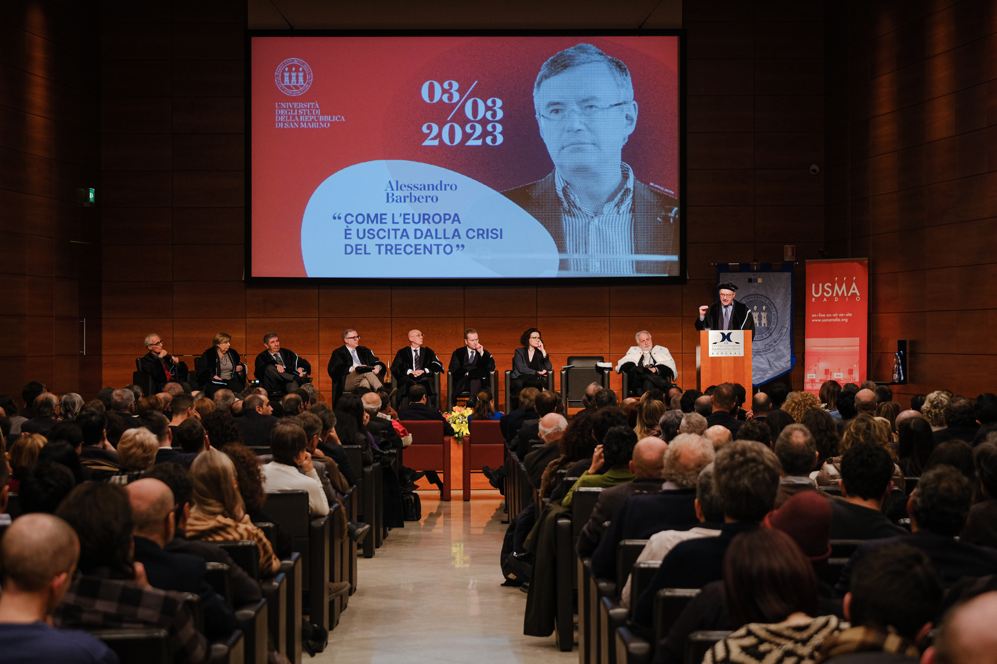 Sottolineando l’esigenza di “dare vita a una normativa che riconosca una reale autonomia dell’Università e detti norme specifiche per il comparto non assoggettandolo più a quelle generali dell’amministrazione”, il Rettore ha quindi lasciato la parola al Segretario di Stato per l’Istruzione e la Cultura, Andrea Belluzzi, al direttore del Dipartimento di Storia, Luciano Canfora, e a Franco Cardini, esponente del consiglio scientifico della Scuola Superiore di Studi Storici dell’Ateneo sammarinese, che ha conferito il dottorato di ricerca honoris causa in Scienze Storiche ad Alessandro Barbero. Proprio lo storico ha tenuto una lectio magistralis dal titolo “Come l’Europa è uscita dalla crisi del Trecento”, ora disponibile sulla pagina Facebook “Università degli Studi della Repubblica di San Marino”.