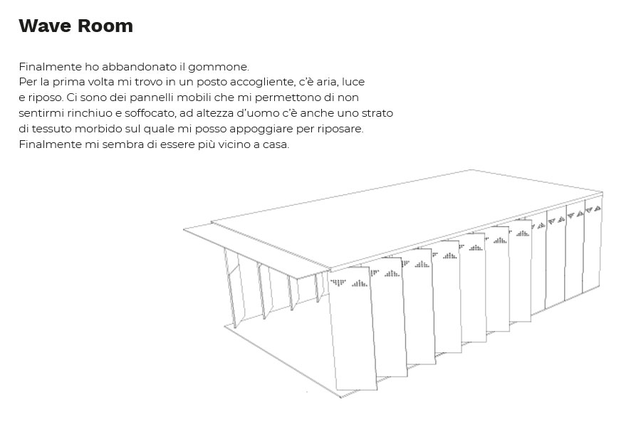 “Con il contributo di Giulia Sezzi, volontaria di Mediterranea, abbiamo affrontato una prima fase relativa ai problemi vissuti da chi vive su Mare Jonio e dai migranti ospitati”, spiega Abdolahian “Siamo quindi passati a una ricerca che ha interessato il viaggio dei migranti dall’Africa all’Italia, provando a ricostruire un contesto più ampio di quello di un semplice salvataggio. Questa attività di studio e approfondimento ci ha permesso di passare quindi alla creazione di soluzioni capaci di risolvere alcuni dei problemi emersi, in maniera pratica. Fra i progetti, quelli che riguardano la ridefinizione del ponte di Mare Jonio andrebbero a sostituire i container attualmente presenti, che danno poche possibilità di spostare gli spazi a seconda delle esigenze. Occorre inoltre fare i conti con le temperature, di giorno molto caldo, di notte l’opposto. Una delle idee proposte coinvolge una struttura aperta, ventilata e con pareti componibili. Ciò anche perchè i container ricordano ai migranti i mezzi utilizzati per attraversare il deserto. Il nostro scopo, invece, è quello di ridare dignità al momento di prima accoglienza“.